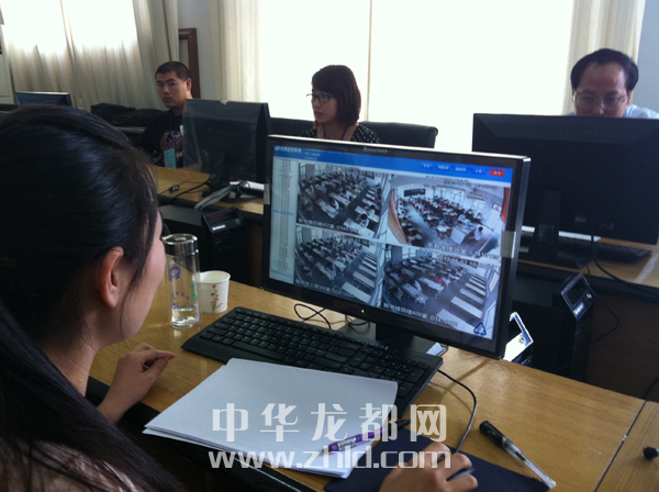 今年高考,我市全部使用視頻標(biāo)準(zhǔn)化考場。在二高視頻監(jiān)考室,9名監(jiān)考員正盯著監(jiān)控屏幕上34個考場的考試情況。記者看到,通過監(jiān)控屏幕,考場內(nèi)考生、監(jiān)考員的一舉一動都能映入眼簾。一名來自西華的監(jiān)考員告訴記者,之前他并不知曉自己會被分配到哪個考場、哪個崗位監(jiān)考,考試當(dāng)天上午在考點抽簽后,才根據(jù)簽位進(jìn)入視頻室監(jiān)考。