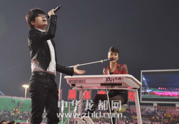 就在觀眾意猶未盡之時(shí),著名演唱組合“玖月奇跡”突然出現(xiàn)在表演場(chǎng)地上,引起觀眾一陣騷動(dòng)?!熬猎缕孥E”的女成員王小瑋在專用樂(lè)器“雙排鍵”上手腳并用,演奏出優(yōu)美樂(lè)曲的同時(shí),男歌手王小海飆起了高音,震驚全場(chǎng),把現(xiàn)場(chǎng)氣氛又一次推向高潮。