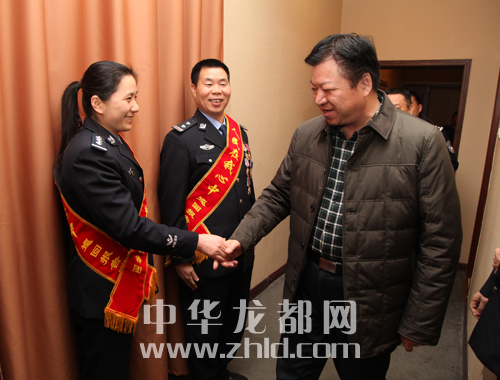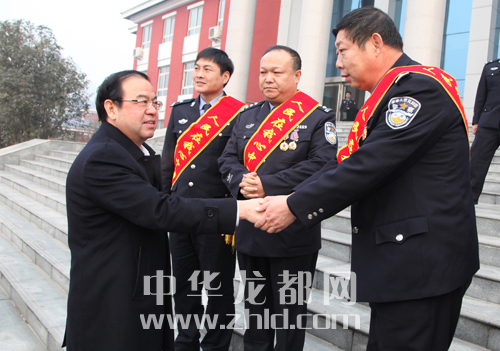 ????報告會前,周口市委常委、政法委書記朱家臣,副市長劉國連,市政府黨組成員、公安局長姚天民親切會見了報告團成員并合影留念。