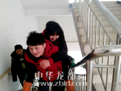 ????雷偉每隔幾天就背一次孔雪珂,這已成了他學(xué)校生活的一部分?!俺宋冶晨籽╃嫔舷聵峭?,我們班其他26個(gè)男生也都背過她。我作為班長,理應(yīng)多做一些?!卑芽籽╃姘踩偷浇淌?,雷偉有點(diǎn)不好意思地說,“第一次背她,我有點(diǎn)兒害羞,但如今已經(jīng)習(xí)慣了?!?/p>