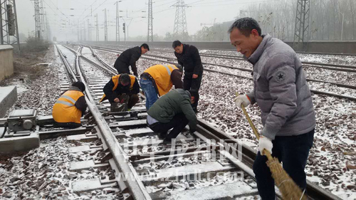 ????11月24日,我市迎來今冬第一場(chǎng)雪。為確保鐵路行車安全,漯阜鐵路有限責(zé)任公司組建黨團(tuán)員突擊隊(duì)清掃道岔積雪,涂油、噴灑防凍液,確保設(shè)備正常運(yùn)轉(zhuǎn),同時(shí)在客運(yùn)站臺(tái)鋪設(shè)地毯、防滑墊等,防止旅客摔傷。圖為突擊隊(duì)隊(duì)員清掃道岔積雪。