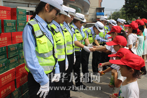 ????當(dāng)前,創(chuàng)建省級(jí)文明城市工作正在周口中心城區(qū)廣泛開(kāi)展,整個(gè)城市越來(lái)越干凈美麗,城市文明程度不斷提升。8月15日上午,在八一大道和七一路交叉口,團(tuán)市委組織數(shù)十名志愿者和孩子協(xié)助交警維護(hù)交通秩序??吹浇痪⒁虩岬煤沽鳑驯常⒆觽兗娂妼⒌V泉水送到她們手中。晚報(bào)記者 王凱 攝