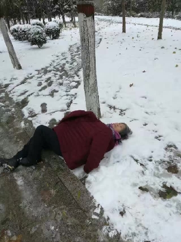 ????11月23日早上,大雪過后的周口銀裝素裹。在一家教育培訓(xùn)機構(gòu)上班的老師單啟航像往常一樣來到周口中心城區(qū)濱河公園晨練。7時許,單啟航在濱河路(市中心醫(yī)院北面)看到一位上了年紀的老大娘躺在雪地上,一臉痛苦。