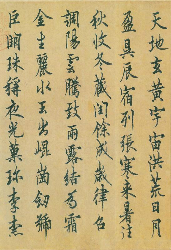 ????《千字文》全書共250句。每四字一句,四句一組,兩組一韻,前后貫通,互不重復(fù)。其內(nèi)容涉及天文、地理、歷史、農(nóng)工、園藝、飲食起居、修身養(yǎng)性及封建綱常禮教等各個方面。包羅萬象,涵蓋面廣泛,其最大優(yōu)點又在于融知識性、可讀性和教化性為一爐,誦讀一遍即感到文采斐然,合轍押韻,瑯瑯上口,易誦易記,梁武帝讀后,龍顏大悅,興奮不已。立即命令刻印,作為“諸王”的習(xí)誦課本,并刊諸于世,為初學(xué)者入門教本。從此,不僅中國帝王之家有了一本集識字、書法和思想內(nèi)容為一體的啟蒙讀物,而且中國社會乃至世界教育史上也有了問世最早、流傳最久、影響最大的蒙學(xué)教材。