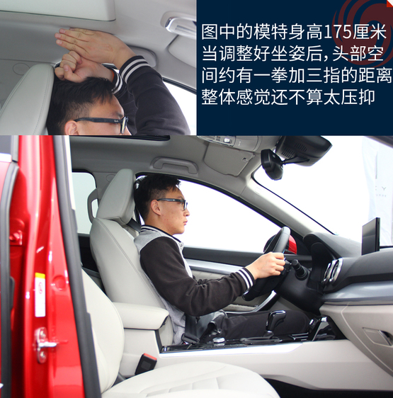 體驗者身高175厘米,前排座椅降到最低的時候頭部還有比較充足的余量,完全不會感覺到壓抑;不過后排頭部就不太行了,頭部距離車頂非常接近,要是身高再高一些的乘客坐進(jìn)后排,已經(jīng)基本上快頂?shù)筋^了。儲物空間中規(guī)中矩,基本上沒有太多讓人驚喜的地方。扶手箱的空間不小,高度也合適,可以放些雜物。
