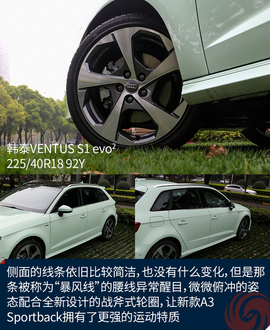 側(cè)面的線條依舊比較簡潔,也沒有什么變化,但是那條被稱為“暴風(fēng)線”的腰線異常醒目,微微俯沖的姿態(tài)配合全新設(shè)計的戰(zhàn)斧式輪圈,讓新款A(yù)3 Sportback擁有了更強(qiáng)的運(yùn)動特質(zhì)。