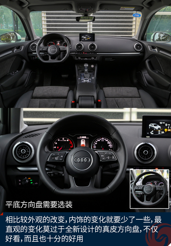 相比較外觀的改變,內(nèi)飾的變化就要少了一些,最直觀的變化莫過于全新設(shè)計的真皮方向盤,不僅好看也十分的好用,發(fā)光的迎賓踏板進(jìn)一步增加了車輛的高級感,中控面板上的鋁合金材質(zhì)的裝飾條質(zhì)感出色,不僅如此,還有多種樣式和材質(zhì)可選;而門板內(nèi)的Alcantara材質(zhì)進(jìn)一步提升了舒適的觸感,當(dāng)然座椅也同樣采用了Alcantara。另外新增加的USB接口也進(jìn)一步增加了行車的便利性,這也讓A3車內(nèi)的USB數(shù)量增加到兩個。同時,全新設(shè)計的MMI系統(tǒng)操作起來也更加便利,邏輯也更加清晰,并且與7英寸液晶顯示屏均成為標(biāo)準(zhǔn)配置,微微朝向駕駛員的設(shè)計也更加合理,同時還支持CarPlay。