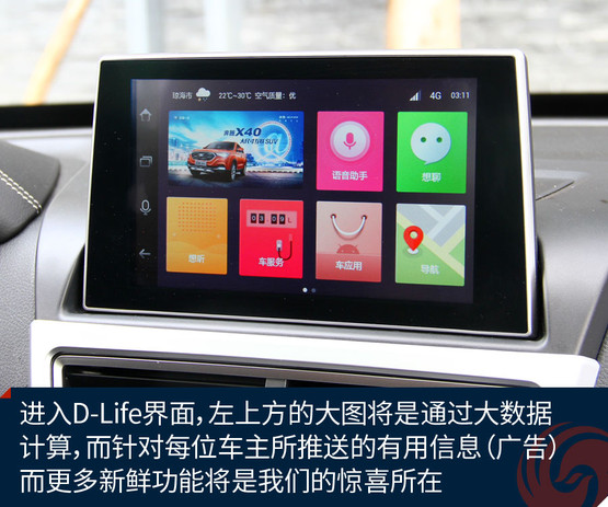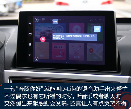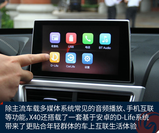 不過跟奔騰X40接觸兩天之后,會發(fā)現(xiàn)它大可不必在對手林立的市場中血拼顏值,靠實(shí)力不俗的獨(dú)門絕技一樣能夠輕松獲得一席之地。既然面向年輕用戶,豐富的車載娛樂系統(tǒng)很關(guān)鍵。大屏幕、手機(jī)互聯(lián)等等似乎已經(jīng)是這類車的標(biāo)配。奔騰X40更進(jìn)一步,所搭載的D-Life系統(tǒng)讓我們看到了它引領(lǐng)潮流的勁頭。