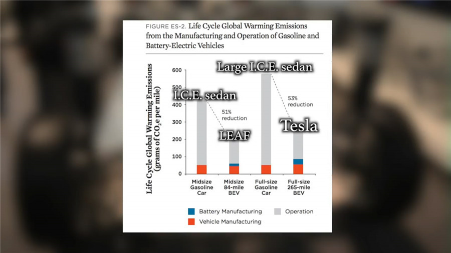 ????????這張表更加清晰,分別統(tǒng)計(jì)了普通內(nèi)燃機(jī)汽車(25MPG=百公里油耗9.4升)、特斯拉Model X 90D、Model S 75D和聆風(fēng)(電池容量24kWh)在車輛生產(chǎn),燃油/電能生產(chǎn)過程以及駕駛使用過程中的排放,可以看到,盡管電動(dòng)車在車輛生產(chǎn)、電能生產(chǎn)過程中產(chǎn)生的排放更高,但行駛工程中的零排放仍然使其在整個(gè)生命周期中的排放更低。