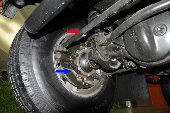 ????上圖為前軸轉向系統(tǒng)特寫,紅色箭頭為轉向拉桿,它負責拉動前輪產生左右的轉向。衛(wèi)士的轉向機構比較特別,其羊角與硬軸直接采用了球頭的連接方式(藍色箭頭所指),整個羊角包裹住球頭,可以產生任意方向的旋轉,這比起傳統(tǒng)的靠上下轉點定位旋轉的前軸,前輪的傾角和束角能在更大的范圍內活動。