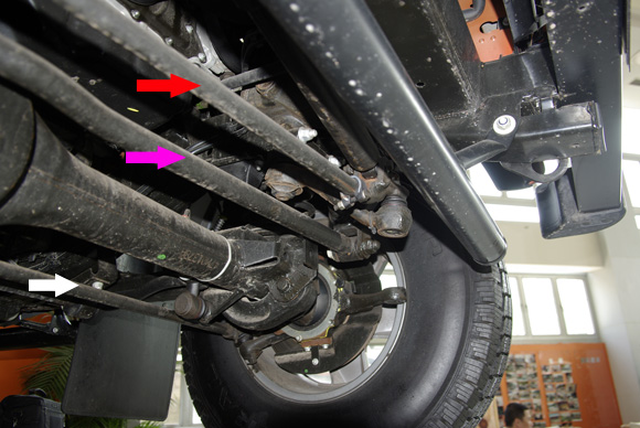 ????前軸特寫二,玫紅色箭頭為橫向推力桿,紅色為轉向拉桿,白色的拉桿連接左右的羊角,紅色的轉向拉桿帶動衛(wèi)士的右前輪轉向,通過白色的拉桿聯(lián)動左前輪,使左右前輪同步的進行轉向。