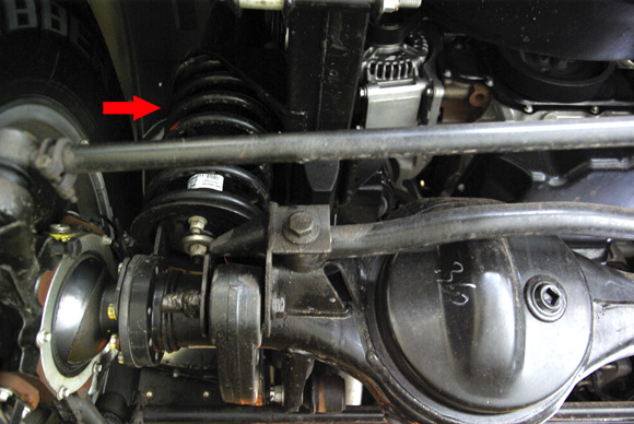 ????衛(wèi)士的后軸采用拖臂式后懸,紅色箭頭所指的拉桿就是拖臂。左右各一根,拖臂及避震機對后軸的自由度進行控制,后軸相對車架的位置和自身的扭轉都得到了控制。