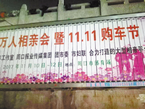 ????據(jù)了解,周口萬人相親會是由市委組織部青年工作辦公室、共青團(tuán)周口市委、市婦聯(lián)、周口報業(yè)傳媒集團(tuán)聯(lián)合主辦的大型相親平臺。為再一次給廣大消費(fèi)者搭建更好的選車、購車平臺,周口報業(yè)傳媒集團(tuán)決定于11月10日至12日在市體育場隆重舉辦2017周口萬人相親會暨“雙十一”購車節(jié)。