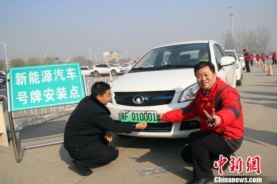 ????保定市民康辰龍領到該市第一副新能源汽車專用號牌?!∮诳×痢z
