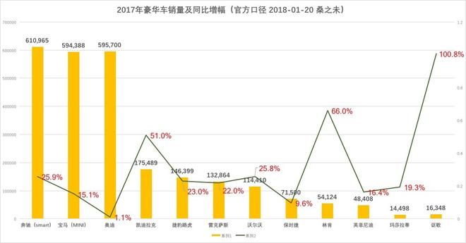 如果以經(jīng)銷商終端零售口徑統(tǒng)計(jì),奔馳(含smart)2017年銷量為624,025輛,其中奔馳品牌(含v級(jí)車)為601,195輛;奧迪品牌為599,279輛;寶馬(含Mini)為580,996輛,其中寶馬品牌為548,363輛;如果以經(jīng)銷商終端零售口徑計(jì)算,奔馳品牌(含v級(jí)車)在2017年豪華車終端零售市場(chǎng)獲得銷售冠軍。