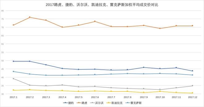凱迪拉克、捷豹路虎、雷克薩斯、沃爾沃四個(gè)品牌銷量在10萬(wàn)輛以上為第二陣營(yíng)。除路虎外,捷豹因進(jìn)口F-pace帶動(dòng)其成交價(jià)上揚(yáng),隨著XE國(guó)產(chǎn)上市銷售,捷豹銷量有望進(jìn)一步增長(zhǎng),價(jià)格進(jìn)一步下探;以銷售進(jìn)口車型為主的雷克薩斯,今年銷量質(zhì)量不錯(cuò),庫(kù)存時(shí)間短,資金周轉(zhuǎn)快,多數(shù)以訂單方式銷售,加權(quán)平均價(jià)在42萬(wàn)上下,成交價(jià)格走勢(shì)平穩(wěn),經(jīng)銷商今年利潤(rùn)也很豐厚。沃爾沃在新款車型的帶動(dòng)下,成交價(jià)格開(kāi)始上揚(yáng);凱迪拉克今年銷量增速較快,通過(guò)下圖我們可以看到,凱迪拉克基本依靠低價(jià)獲取銷量的增長(zhǎng),成交價(jià)格進(jìn)一步走低,經(jīng)銷商的利潤(rùn)需要依靠廠家補(bǔ)貼。