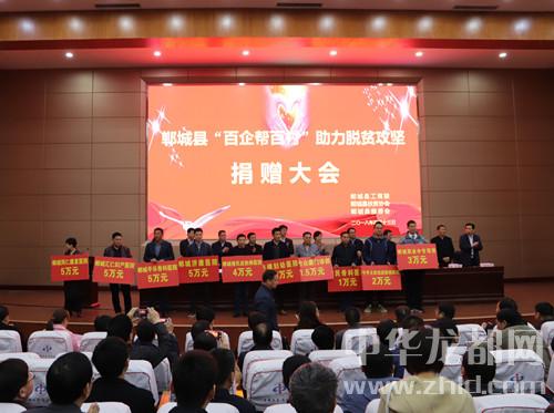 中華龍都網(wǎng)訊(周口報(bào)業(yè)全媒體記者 徐松 文/圖)4月13日,鄲城縣召開“百企幫百村”助力脫貧攻堅(jiān)捐贈(zèng)大會(huì),全縣129家企業(yè)反哺社會(huì)助力脫貧攻堅(jiān),現(xiàn)場捐贈(zèng)近1300萬元。鄲城縣四個(gè)班子領(lǐng)導(dǎo)、部分縣處級(jí)領(lǐng)導(dǎo)干部、縣慈善會(huì)會(huì)長、縣扶貧協(xié)會(huì)會(huì)長、縣直各單位和鄉(xiāng)鎮(zhèn)負(fù)責(zé)人等參加捐贈(zèng)大會(huì)??h委書記羅文閣發(fā)表講話,縣長李全林主持會(huì)議。