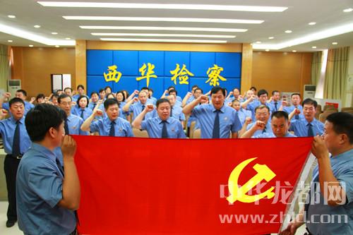 中華龍都網(wǎng)訊(周口報業(yè)全媒體記者 竇娜 通訊員 屈琳琳)“我志愿加入中國共產(chǎn)黨,擁護(hù)黨的綱領(lǐng),遵守黨的章程,履行黨員義務(wù),執(zhí)行黨的決定……”6月28日,面對鮮紅的黨旗,西華縣人民檢察院副檢察長、黨支部書記劉新建帶領(lǐng)全體黨員高舉右手,重溫入黨誓詞。