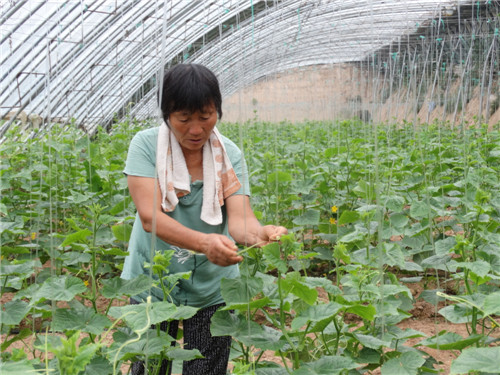 近年來(lái),沈丘縣周營(yíng)鎮(zhèn)大力發(fā)展藥材種植和特色瓜果蔬菜種植,既解決了貧困戶的就業(yè)問(wèn)題,又促進(jìn)了當(dāng)?shù)剞r(nóng)業(yè)生產(chǎn)。圖為7月24日,貧困群眾孫素英在蔬菜種植基地管理吊籐晚秋小黃瓜。 記者 韋偉 通訊員 謝辛凌 攝