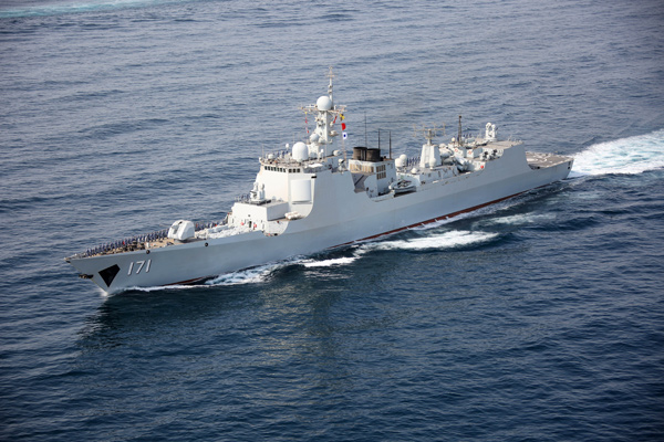 2009年1月19日下午4點(diǎn)45分左右,??谂炘谧o(hù)航過(guò)程中與法國(guó)F730“花月”號(hào)護(hù)衛(wèi)艦在亞丁灣西部海域不期而遇。法艦主動(dòng)向??谂灤虺鰺艄庑盘?hào),通報(bào)舷號(hào)。隨后,法艦調(diào)整航向,與??谂炌蚝叫小.?dāng)兩艦艦首對(duì)齊時(shí),“花月”艦向??谂烒Q笛致敬,同時(shí),“花月”艦上法國(guó)軍官向??谂炁e手敬禮。法艦艦長(zhǎng)還電臺(tái)表示,他們正在返回母港吉布提途中,法軍官兵非常欣賞中國(guó)海軍現(xiàn)代化驅(qū)逐艦,特向中國(guó)護(hù)航官兵致意。
