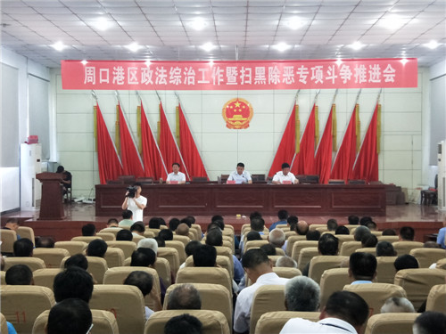 9月6日,周口港區(qū)召開政法綜治工作暨掃黑除惡專項斗爭推進會議。港區(qū)黨委書記孫紅偉出席會議并講話,紀委書記尚紅偉主持會議。港區(qū)公安分局政委何學民對掃黑除惡工作做具體部署。港區(qū)直屬各單位、市直派駐機構(gòu)負責人,公安、城管、消防、李埠口鄉(xiāng)全體黨員干部,各行政村主要負責人和村治保主任等近300人參加會議。