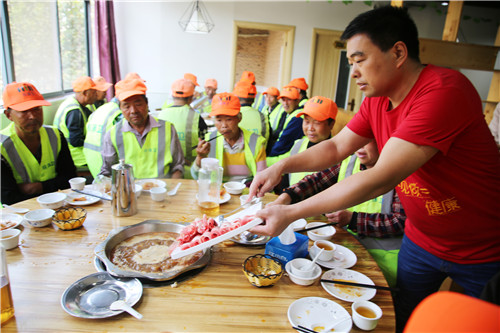 姜玉伸是承擔(dān)鳴鹿路北段保潔任務(wù)的一名老環(huán)衛(wèi)人,他告訴記者:“從今天夏天開始,該店就在店里設(shè)置了環(huán)衛(wèi)工人免費休息飲水點,有時候工作量大的時候,中午回不了家,店老板就讓我們在飯店免費就餐。今天,該店又準(zhǔn)備了免費火鍋,讓我們提前過重陽節(jié),我們感覺心里暖暖的?!?/p>