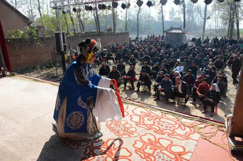 11月3日上午,記者在平店鄉(xiāng)吳吉屯村看到,剛剛落成的村室門前搭建了一個大舞臺,洛陽市的一家豫劇團(tuán)正在表演精彩的古裝戲曲,舞臺前坐滿了村民(如圖)。
