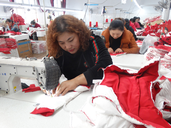11月11日,沈丘縣周營鎮(zhèn)慧恩服飾來料加工點(diǎn),當(dāng)?shù)厥畮酌羰亍扒上眿D”正忙著加工訂單兒童冬季服裝。