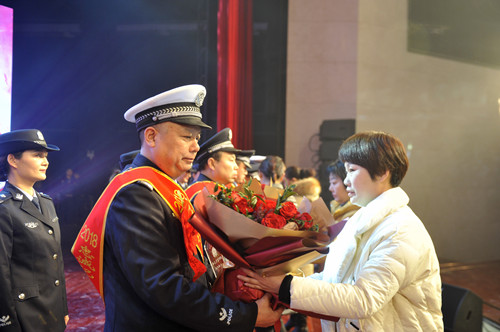晚會現場,頒獎環(huán)節(jié)和文藝節(jié)目輪番呈現,精彩紛呈。由32個民警子女上演的情景劇《天之大》,警寶們用稚嫩的聲音唱出了警察家庭的付出和他們對父母的愛,讓現場觀眾流下感動的淚水;最后一個頒獎環(huán)節(jié),當15名警嫂手捧鮮花獎杯走上舞臺為他們從警10年、20年、30年的愛人頒獎時,整個舞臺愛意濃濃。
