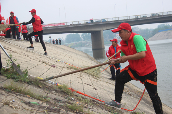 當(dāng)天上午,志愿者拿著掃帚、鐵锨等工具,對堤坡的塑料袋、礦泉水瓶等垃圾進(jìn)行清理,還有一些志愿者負(fù)責(zé)清理河堤上的垃圾。雖然垃圾雜物又臟又臭,但是志愿者相互協(xié)作,干得熱火朝天。
