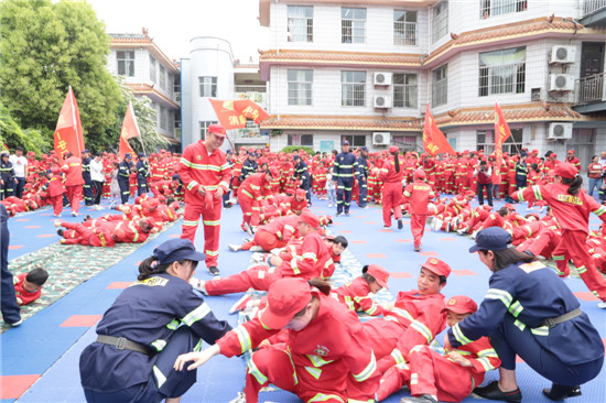 記者在現(xiàn)場看到,數(shù)十名老師分工明確,變身為“消防教官”;千名孩子隊列整齊,成為“小小消防員”;家長則相伴左右,擔(dān)任“大大消防員”的角色。演練從“火災(zāi)”現(xiàn)場撤離拉開序幕,消防健身體操、火場逃生、攀爬通過軟橋、打滾自救、滅火實驗,還有催人淚下的兒童防走失演練“小蝌蚪找媽媽”?!靶◎蝌秸覌寢尅被顒邮亲尯⒆觽儫o人引導(dǎo)的情況下,在所有家長穿著相同、戴著帽子、戴著眼罩的茫茫人海中找爸爸媽媽。