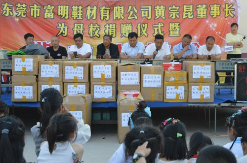 當(dāng)日下午,廣東東莞富明鞋材有限公司董事長(zhǎng)黃宗昆為母校薛廟小學(xué)師生捐贈(zèng)愛(ài)心運(yùn)動(dòng)鞋儀式在馬頭鎮(zhèn)薛廟小學(xué)舉行。馬頭鎮(zhèn)中心校副校長(zhǎng)李永長(zhǎng)、中心校辦公室主任章紅勝、薛廟行政村黨支部書(shū)記黃志華等村兩委領(lǐng)導(dǎo)、校長(zhǎng)黃景思、名譽(yù)校長(zhǎng)孫道紅、全校260 多名師生及部分學(xué)生家長(zhǎng)600多人參加了當(dāng)天的捐贈(zèng)儀式。