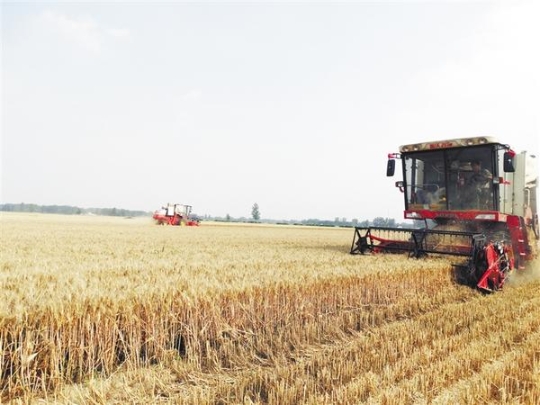 5月28日,沈丘縣周營鎮(zhèn)歐營行政村的麥田里,兩臺大型收割機(jī)正在緊張工作。眼下,該縣102萬畝小麥已陸續(xù)成熟,當(dāng)?shù)剞r(nóng)民緊抓有利天氣條件搶收小麥。謝辛凌 攝