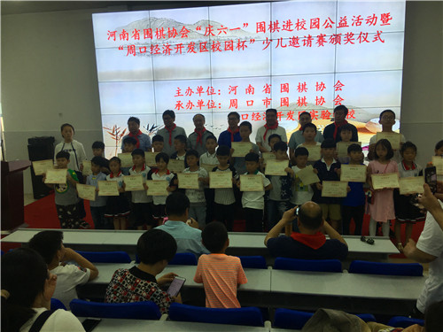6月1日,省圍棋協(xié)會(huì)在周口經(jīng)濟(jì)開發(fā)區(qū)實(shí)驗(yàn)學(xué)校舉行慶“六一”圍棋進(jìn)校園公益活動(dòng)暨校園杯圍棋邀請(qǐng)賽。省圍棋協(xié)會(huì)副會(huì)長(zhǎng)郭寶林、秘書長(zhǎng)袁曦、副秘書長(zhǎng)張新華,市工信委主任姚衛(wèi)田,周口圍棋協(xié)會(huì)有關(guān)領(lǐng)導(dǎo)參加。