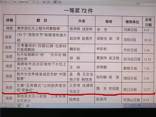 據(jù)介紹,本屆河南新聞獎(jiǎng)獲獎(jiǎng)作品具有“把握時(shí)代脈搏 謳歌時(shí)代精神”“反映重大主題 積極服務(wù)大局”“講述中國故事 彰顯主流價(jià)值”等特點(diǎn),主題深刻、事實(shí)準(zhǔn)確、文風(fēng)生動(dòng)、表現(xiàn)新穎,充分反映我省新聞戰(zhàn)線積極宣傳報(bào)道黨的十八大以來我省發(fā)展的歷史成就、歷史變革,報(bào)道我省各行各業(yè)改革開放的豐碩成果和感人事跡,特別是聚焦打贏精準(zhǔn)扶貧攻堅(jiān)戰(zhàn),形成宣傳的強(qiáng)大聲勢(shì)。作品堅(jiān)持正確的輿論導(dǎo)向、唱響主旋律、大力宣傳社會(huì)主義核心價(jià)值觀,為新時(shí)代中原更加出彩提供強(qiáng)有力的輿論支撐和良好的輿論氛圍。《太康“五養(yǎng)模式”讓特困養(yǎng)老實(shí)現(xiàn)“菜單式”》具有“重大題材”“重大影響”“重大意義”等特點(diǎn),經(jīng)過專家層層評(píng)審,最終在眾多參評(píng)作品中脫穎而出,一舉奪得了河南新聞獎(jiǎng)一等獎(jiǎng)。