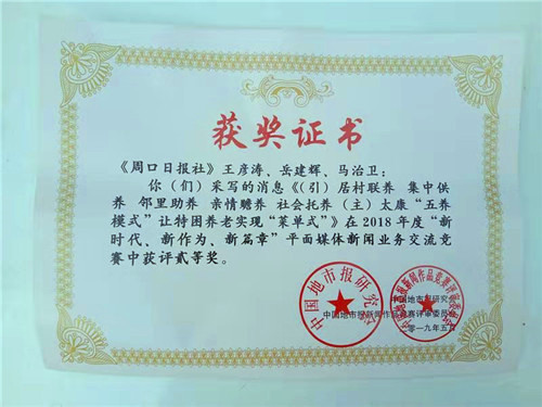 中國地市報(bào)新聞獎(jiǎng)評(píng)選活動(dòng)由中國地市報(bào)研究會(huì)主辦,每年舉辦一次,在全國有著廣泛的影響,此項(xiàng)新聞獎(jiǎng)評(píng)選活動(dòng)涉及全國幾乎所有地市黨報(bào),不僅是展示地市黨報(bào)形象的重要舞臺(tái),也是衡量地市黨報(bào)辦報(bào)水平的重要標(biāo)志,同時(shí)也是以新聞的形式展示各地亮點(diǎn)工作的重要。《太康“五養(yǎng)模式”讓特困養(yǎng)老實(shí)現(xiàn)“菜單式”》稿件在此項(xiàng)新聞獎(jiǎng)評(píng)選中,同樣表現(xiàn)不凡,最終榮獲中國地市報(bào)新聞獎(jiǎng)二等獎(jiǎng)。