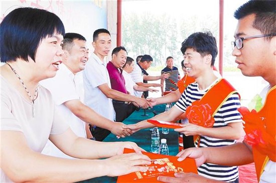 近日,市城鄉(xiāng)一體化示范區(qū)搬口辦事處曾樓行政村文化大院里,鑼鼓喧天,喜氣洋洋,熱鬧非凡。原來是村民在為該村大學(xué)新生舉辦歡送會(huì),同時(shí),該村黨支部還為這些大學(xué)新生發(fā)放了助學(xué)金。據(jù)了解,曾樓行政村有3000多人,2019年共有27人金榜題名,其中14人考入本科院校,13人考入??圃盒?。記者 張勁松 攝