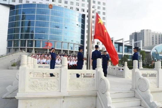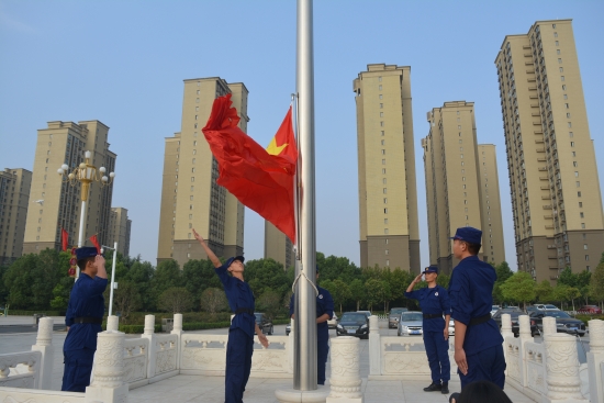 開發(fā)區(qū)黨委班子成員和大家一起齊聲高唱國(guó)歌,在清晨的曙光中,升起五星紅旗。