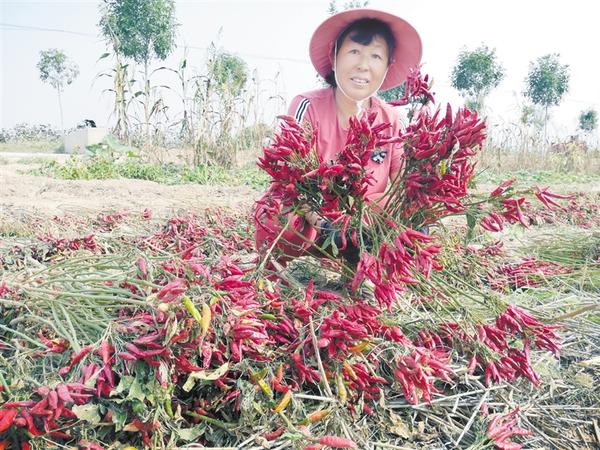 近日,扶溝縣汴崗鎮(zhèn)的辣椒種植戶們迎來(lái)豐收。汴崗鎮(zhèn)積極引導(dǎo)農(nóng)民調(diào)整種植結(jié)構(gòu),大力發(fā)展“訂單式”辣椒產(chǎn)業(yè),成為遠(yuǎn)近聞名的辣椒種植專業(yè)鎮(zhèn),推動(dòng)了脫貧攻堅(jiān)工作和鄉(xiāng)村振興戰(zhàn)略實(shí)施。圖為該鎮(zhèn)于營(yíng)行政村村民李素英向記者展示豐收的辣椒。記者 謝永靜 攝