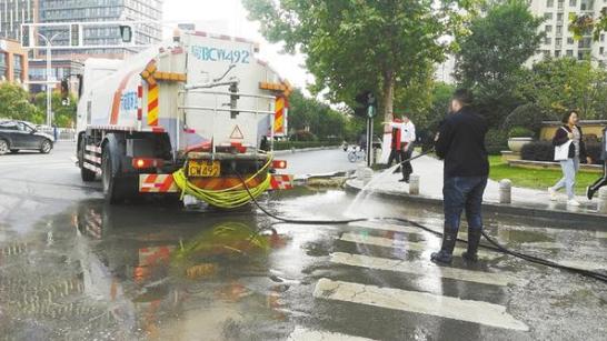 10月20日,中心城區(qū)慶豐路與周口大道交叉口處,市城鄉(xiāng)一體化示范區(qū)工作人員正在清洗路面。近日,我市有關(guān)部門(mén)抽調(diào)人力清洗路面,美化環(huán)境,城市變美了,市容變靚了。
