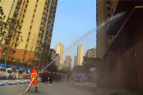 當(dāng)日下午,高磊向參會人員演示并講解了滅火器的使用方法,并現(xiàn)場邀請社區(qū)干部和物業(yè)公司相關(guān)負責(zé)人員實際體驗滅火器的使用。隨后,在建業(yè)森林半島小區(qū)開展了消防演練活動。