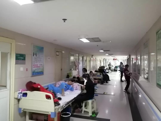 在周口市中心醫(yī)院門診部輸液處,數排輸液座椅坐滿了輸液的患者,患者中絕大部分是孩子。在周口市中心醫(yī)院住院部11樓兒科A、B兩個病區(qū),每個病房內全部住滿患者,病區(qū)走廊已經布滿加床,一些病人只能臨時住在加床上??梢钥吹郊哟驳木幪?,已經排到了50號之后。