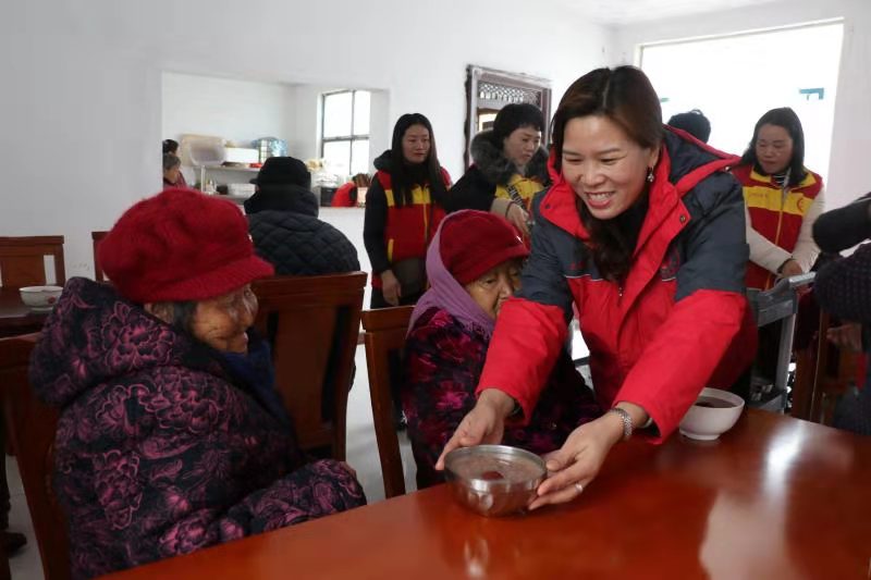 “開飯嘍!”中午時(shí)分,志愿者們將老人一一攙扶到餐廳坐下,隨后將一碗碗香氣四溢、且冒著熱氣的八寶粥端到老人跟前?!跋悖嫦?!”80歲的黃柏功老人舀了一勺八寶粥放到嘴里品了品笑著說(shuō)。吃著八寶粥,老人想起了以前的艱苦生活,他禁不住激動(dòng)地哭了起來(lái):“以前,吃了上頓沒(méi)下頓,想吃一塊白面饃,都得等到過(guò)年??涩F(xiàn)在,天天不斷肉,生活越來(lái)越好。這都是共產(chǎn)黨給咱的福啊。”