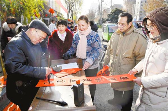 1月19日,由周口市民間文藝家協(xié)會(huì)、川匯區(qū)文聯(lián)聯(lián)合舉辦的“送萬(wàn)福進(jìn)萬(wàn)家”義寫春聯(lián)活動(dòng),在周口華威民俗文化博物苑門前舉行。來(lái)自市書協(xié)、川匯區(qū)書協(xié)的20多名書法家現(xiàn)場(chǎng)揮毫潑墨,義寫春聯(lián)和“福”字,受到市民的一致好評(píng)。記者 梁照曾 攝
