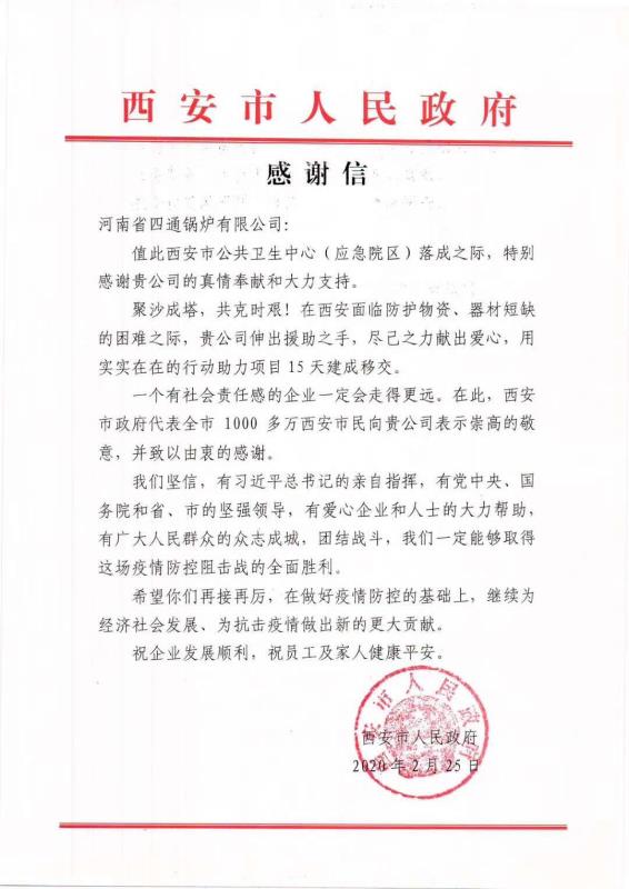 “聚沙成塔,共克時艱!在西安面臨防護(hù)物資、器材短缺的困難之際,貴公司伸出援助之手,盡己之力獻(xiàn)出愛心,在此西安市政府代表全市1000多萬西安市民向貴公司表示由衷的感謝”。這是西安市政府對太康縣拔尖人才、河南省四通鍋爐有限公司總經(jīng)理馮坤的感謝信。一方有難,八方支援。在新聞上了解到武漢新冠肺炎疫情突發(fā)的情況后,他連夜與中國紅十字會和武漢紅十字會取得聯(lián)系,詢問向新建的火神山醫(yī)院捐贈醫(yī)用鍋爐和捐款事宜,通過網(wǎng)上銀行將30萬善款轉(zhuǎn)入武漢紅十字會賬戶中。