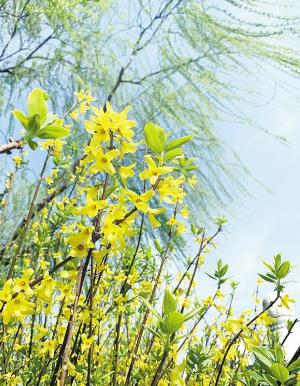 作為春天的信使,一叢叢嬌黃的連翹花,為大地帶來了濃濃春意。花朵在春風(fēng)的吹拂下?lián)u曳,團團簇簇,涌動如金色波浪。走近之時,聞花香淡雅、賞滿枝金黃,人們也以“報春花”來稱呼它。
