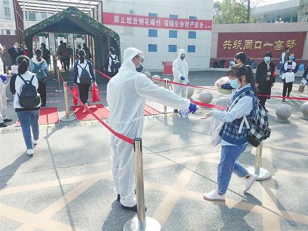 圖一 4月7日,周口一高三年級學(xué)生在入校前測量體溫。當(dāng)天,我市高中三年級學(xué)生正式復(fù)課,廣大學(xué)生按照疫情防控要求,錯峰、錯時(shí)有序入校。 記者 張洪濤 攝