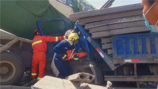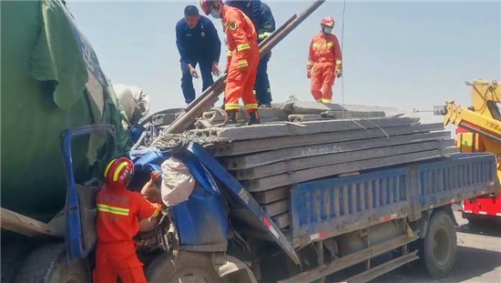 貨車(chē)和水泥罐車(chē)相撞 多方合力救出司機(jī)