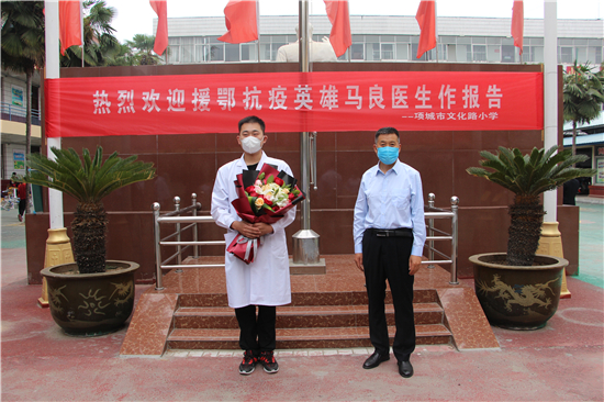 據(jù)了解,馬良醫(yī)生是項(xiàng)城市文化路小學(xué)畢業(yè)的優(yōu)秀學(xué)子,是一名剛參加工作不久的90后醫(yī)生,是我省第十一批援鄂醫(yī)療隊(duì)隊(duì)員。他用樸實(shí)的語(yǔ)言講述了他們請(qǐng)纓戰(zhàn)“疫”的初心和經(jīng)歷。他是家中獨(dú)子,但他更是一名醫(yī)生,在危難面前,他勇敢地?fù)?dān)當(dāng)起醫(yī)生的職責(zé)。在湖北黃陂,他穿著厚厚的防護(hù)服每天至少要工作12個(gè)小時(shí),要克服常人難以體會(huì)的各種困難。雖然身心疲憊,但看到患者從重癥到輕癥再到治愈出院,內(nèi)心感到無(wú)比的欣慰和滿(mǎn)足。沒(méi)有華麗的語(yǔ)言,沒(méi)有激昂的口號(hào),但字字句句卻感人肺腑,展現(xiàn)了援鄂隊(duì)員們?cè)跊](méi)有硝煙的戰(zhàn)場(chǎng)上,與時(shí)間賽跑,與病魔較量,救死扶傷、無(wú)私奉獻(xiàn)、大愛(ài)無(wú)疆的職業(yè)道德和崇高精神。老師們倍受鼓舞,決心立足崗位、再創(chuàng)佳績(jī);學(xué)生們深受教育,立志奮發(fā)向上、成才報(bào)國(guó)。