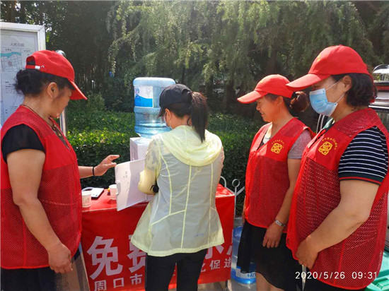 6月3日,在周口中心城區(qū)七一路上的周口人民公園附近,由市慈孝文化促進(jìn)會(huì)的志愿者設(shè)立的免費(fèi)飲水點(diǎn)前,不少市民正在接水喝,為炎炎夏日里的市民送上一份清涼。 記者 張洪濤攝
